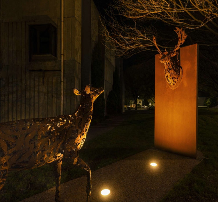 Sean likes to juxtapose in his work the forms of introduced species with indigenous flora or fauna, reflecting the impact of human contact with the natural world. In this work he chose to model the deer from huia, as the huia "has almost become the artistic poster child of our impact on indigenous species'.