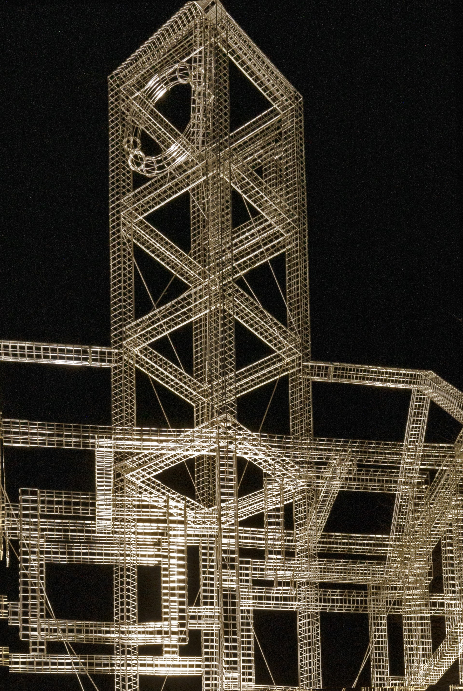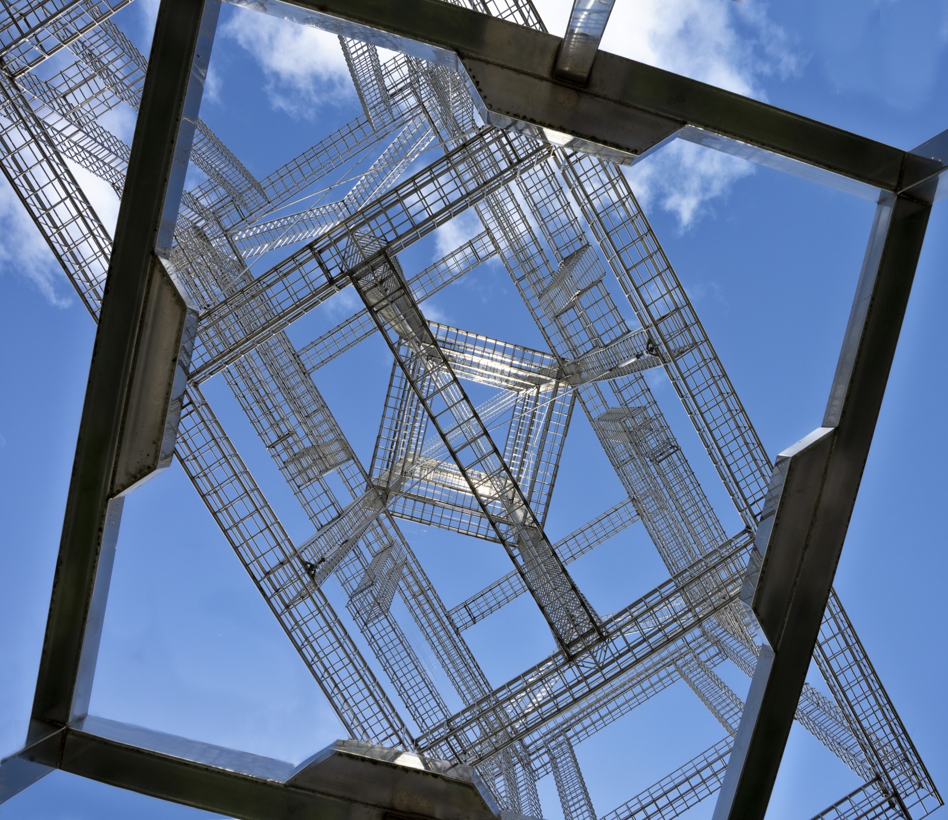 All structure above the base section is of stainless steel rods formed into frames, appearing as filigree against the trees and skyline. Depending on the light and the position of the bystander the tower seems to appear or to disappear.