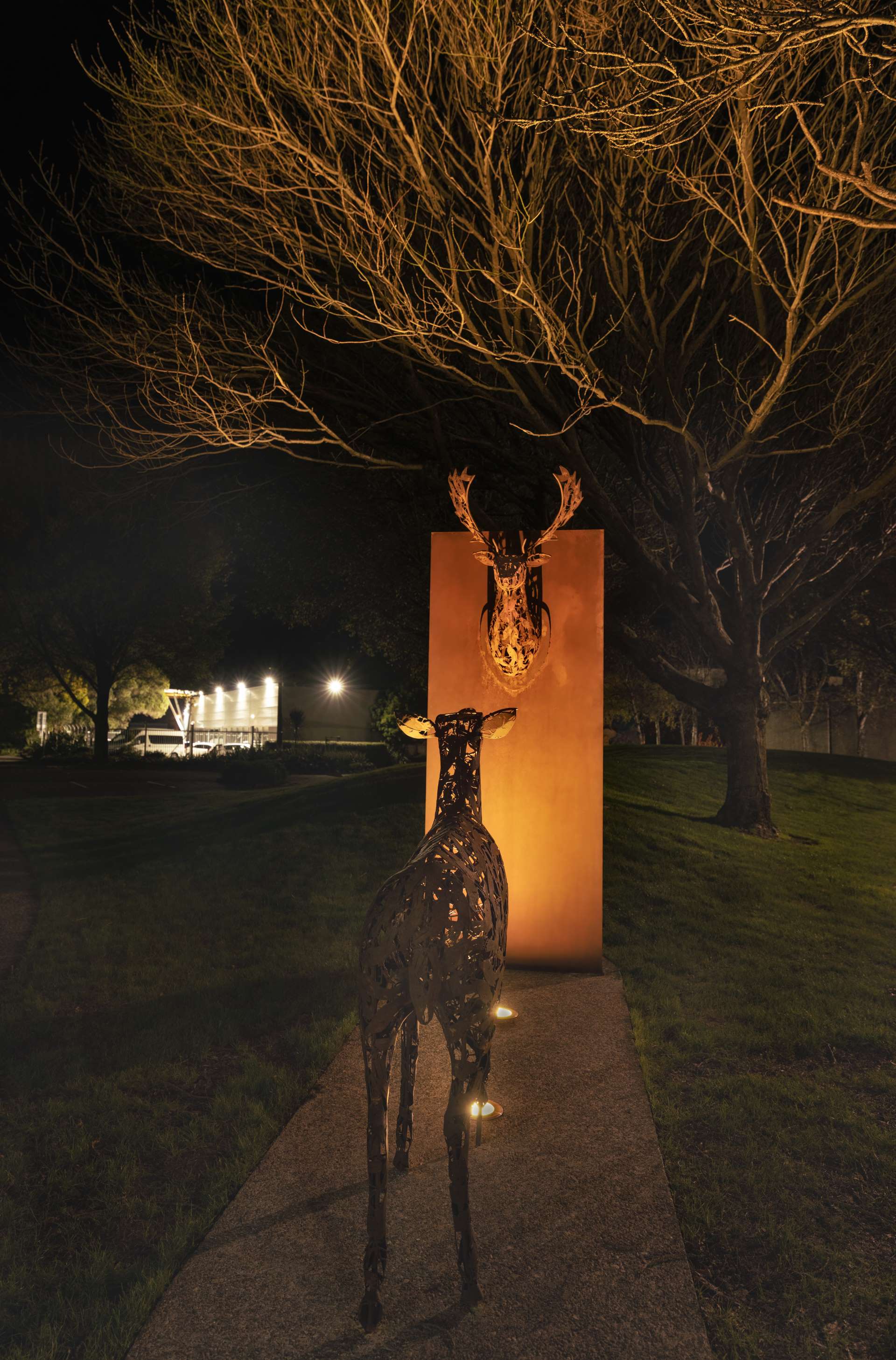 Sean likes to juxtapose in his work the forms of introduced species with indigenous flora or fauna, reflecting the impact of human contact with the natural world. In this work he chose to model the deer from huia, as the huia "has almost become the artistic poster child of our impact on indigenous species'.